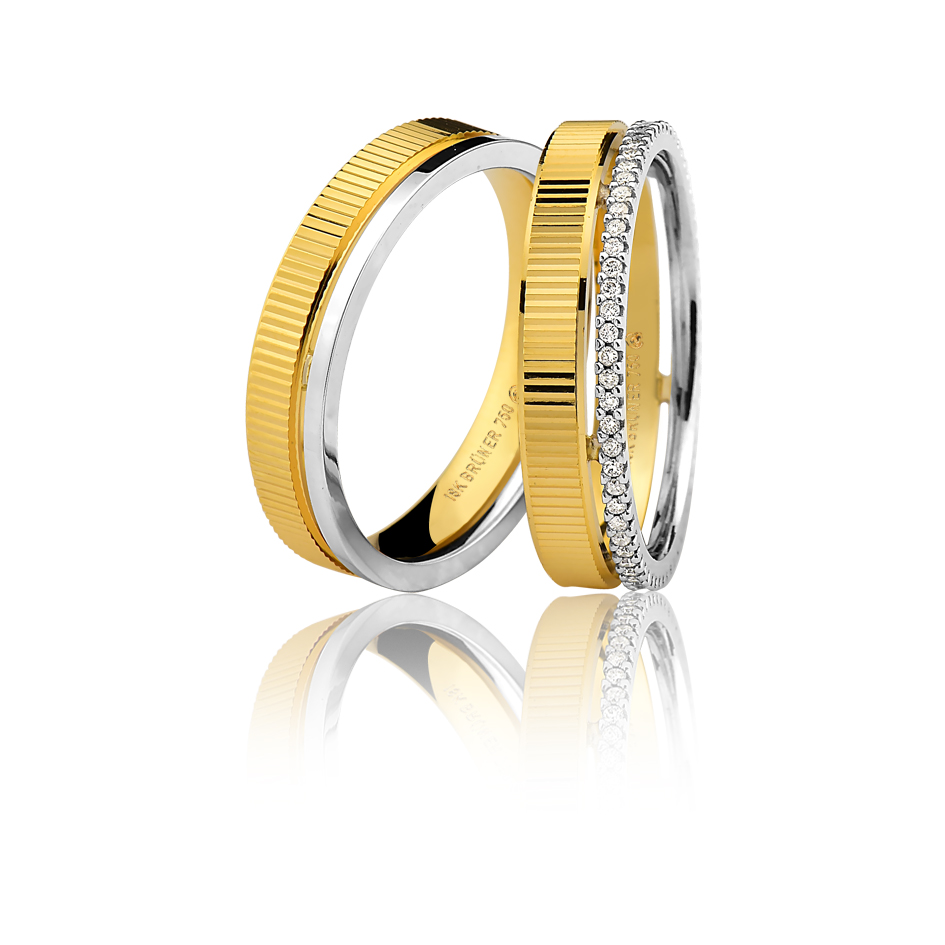 Par alianças trabalhadas detalhe ouro branco e ouro amarelo 18k 1 fila de diamantes