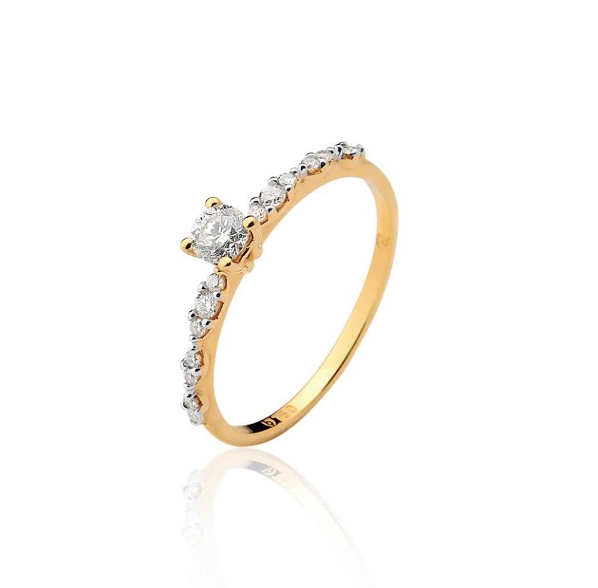 Anel ouro amarelo 18k com diamante central e nas laterais