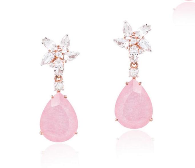 Brincos ouro amarelo 18k com topázios brancos e quartzo rosa